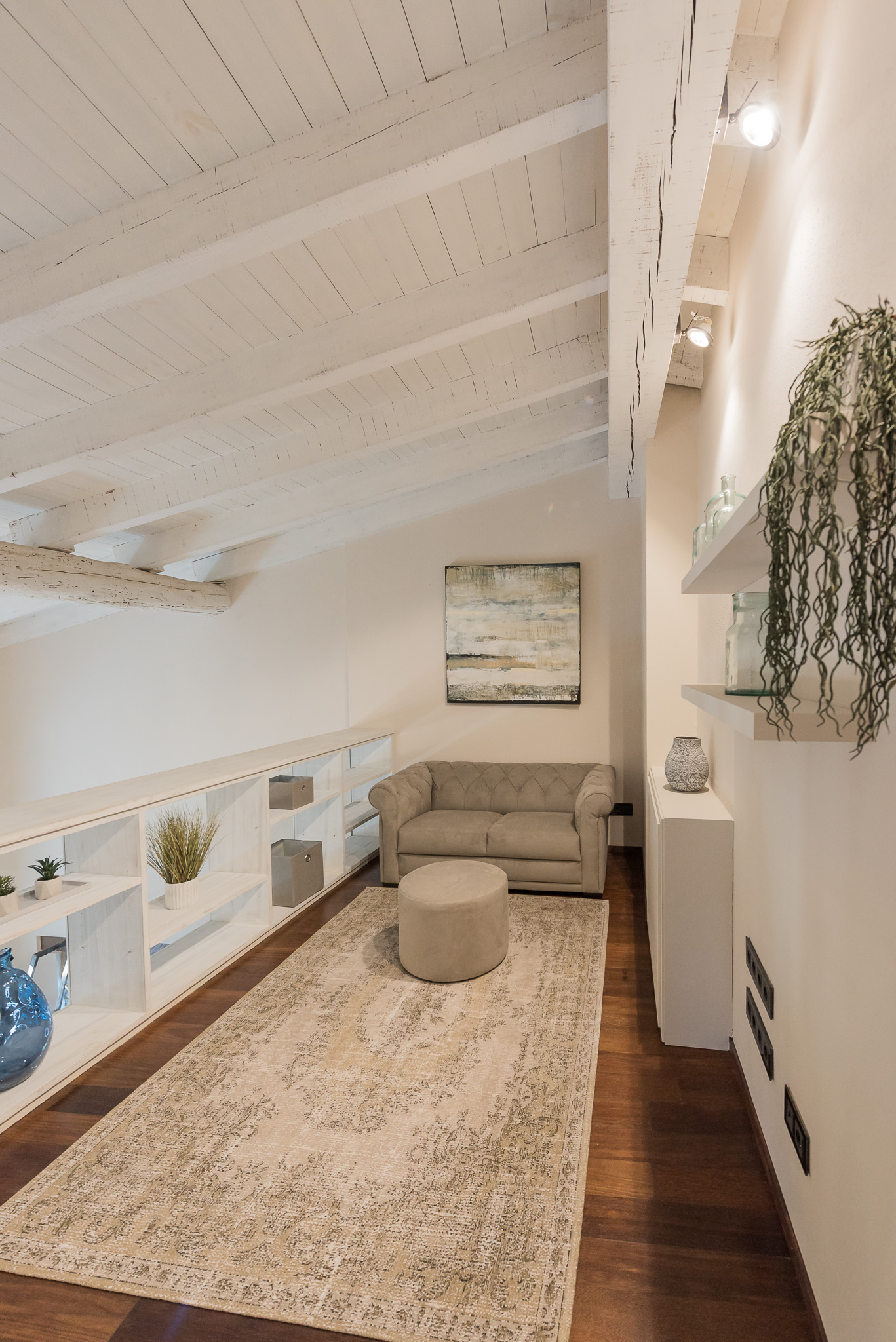 Bathed in natural light and with white wooden beams that bring warmth, this space is ideal for relaxing on the overstuffed sofa and its ottoman after a day discovering the wonders of Girona.
