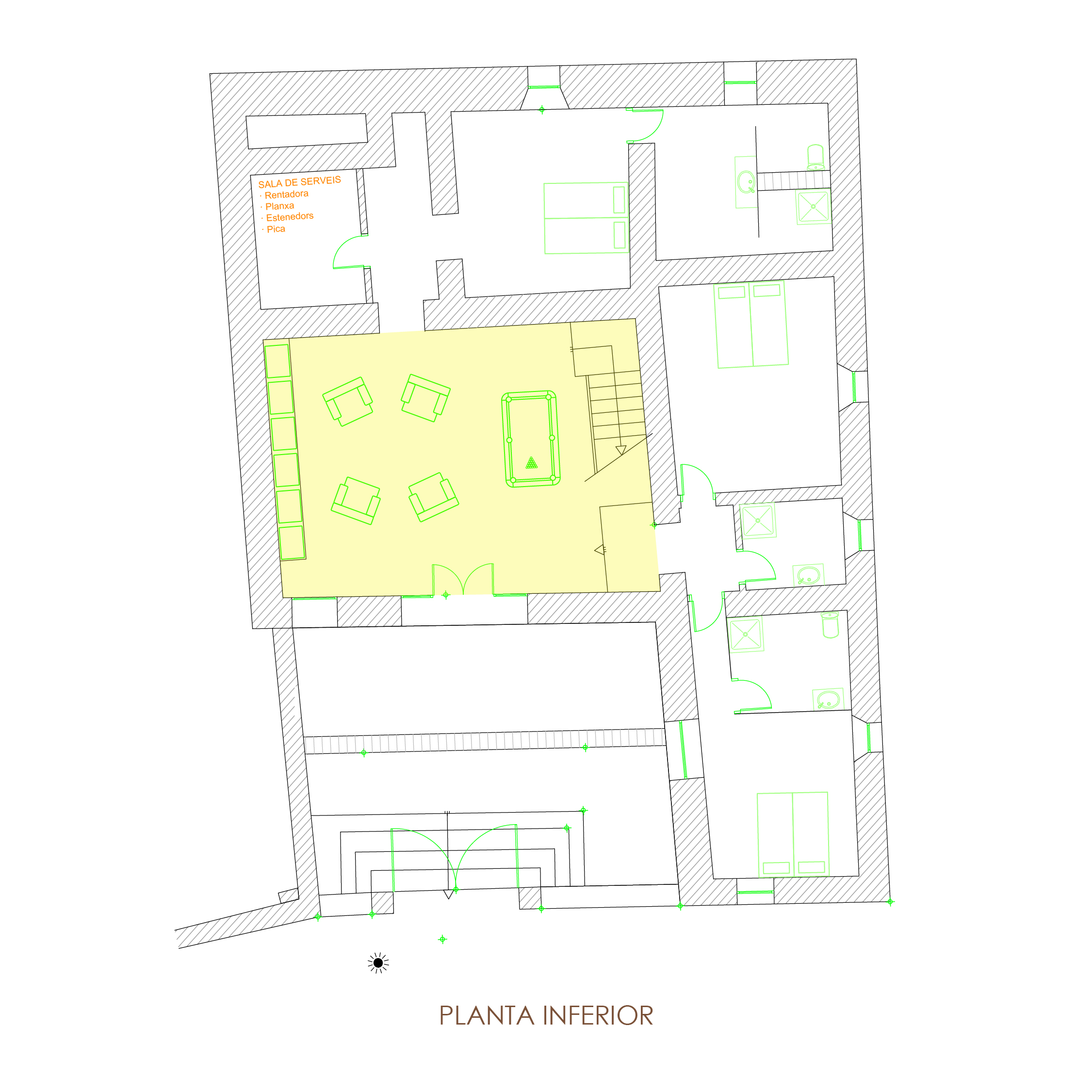 Cada moble ha estat seleccionat meticulosament per oferir no només confort sinó també un estil sofisticat que complementa la textura rústica de l'entorn. Els sofàs amplis i acollidors, vestits de teixits suaus i tons neutres, conviden a enfonsar-se en la seva profunditat per gaudir d'una lectura, una conversa tranquil·la o simplement per relaxar-se després d'un dia d'aventura.
